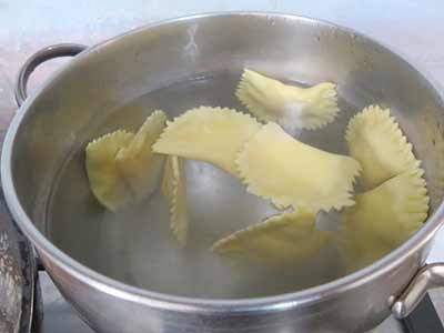 (14)ラビオリを塩入りのお湯でゆでる。