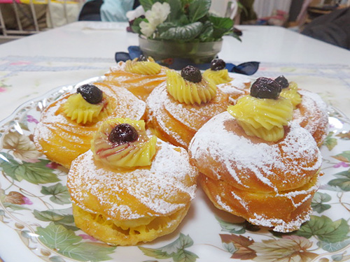 ![]() イタリアの3月19日はいわゆる父の日。 イエスの養父ジュセッペ(聖ヨセフ)の 「サン・ジュセッペ」です。 こちらの暦には、 毎日、守護聖人の名前がついていて カレンダーにも記されています。 3月19日のサン・ジュセッペの日は、 国際女性デーと復活祭のあいだに挟まれていて 母の日より少し地味に感じますが、 父親の存在も大きいものです。 そして、父親を尊敬している人が とても多いと感じます。 友達の家で 「マンマが選んだ素敵な彼がパパなの」 と言うのを聞いて、 微笑ましく思ったことがあります。 そういえば、私の子どもたちが幼稚園の頃、 園児たちのパパへのプレゼントは、 絵と暗記した長い詩を それぞれのお父さんの前で披露することでした。 その長い詩の内容と 一生懸命に披露するかわいい姿に、 親は涙しながらたたえたものです。 いったい、幼稚園の先生は、 こんなに小さな子どもたちに、 どうやって長い詩を覚えさせたのだろう? 気になって、お教室を覗いたことがあります。 園児たちが壁一面の大きな紙に、 アルファベットと絵を組み合わせて詩を描き、 それを何回も言ってました。 詩を通して、 親の大切さと感謝を伝えていたと思いますが、 その努力と忍耐力は、 いかほどのものだったのでしょう。 さて、今回は父の日に食べるドルチェ、 ゼッポレ・ディ・サン・ジュセッペです。 レシピ239でご紹介したゼッポレは、 エトナ地方のもので、 今回はそれとは異なる南の地方のものです。 シューは少しかため目に練り上げて、 クリームもかために作ります。 友人の作るものはシュー生地のあいだに クリームを挟むものでした。 クリーム好きの私にはぴったりです。 食べやすいように少し小さめに作りました。 どうぞお楽しみくださいね。