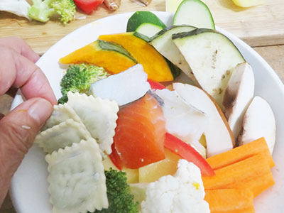 ![]() 最近の楽しみに、カルフールという スーパーマーケットでの買い物があります。 毎週水曜日は、60歳以上10%割引の日で、 それをめがけてでかけます。 初めてでかけたときのこと。 こんなにたくさんの老人が この地区にいるのかしら?と思うほど、 店内は老人ばかりでした。 そして、彼らのカートやカゴは一杯です。 どう見ても老人が消費する分量ではありませんが、 きっと1週間分まとめての買い物なんでしょう。 いきいきと買い物をしている老人を見ていると こちらまでも元気になってきます。 なにより水曜日のカルフールは、 なにかが違います。 それは老人が醸し出す音とリズムです。 老人同士が大きい声で話す、 のんびりとした挨拶、長い世間話。 まるで老人社交クラブのようで、 居心地が良いです。 音楽や照明で買い物意欲が湧く と聞いたことがありますが、 私は割引を彼らと共有することで、 さらにお得感を感じ買い物が進みます。 こんなこともありました。 私がビスケットを買おうとしているとき、 「こっちの方が今日はお買い得よ。 そしておいしいわよ。」なんて 全く知らない方が助言をくれました。 老人的おせっかい、私は大好きなのです。 私にとって「水曜日」は とても楽しいお買い物なのです。 さて、寒くなってきているミラノです。 冷たい雨にあたり、風邪をひきました。 料理はかんたんにすませたいです。 ミラノに、好きな具材を選んでお皿に入れて、 蒸して出してくれるところがあります。 これだ! と思いました。 お皿洗いをしなくてすむ紙皿を使って、 冷蔵庫の中にあるものを組みあわせて、 蒸しました。 私は大好きなザクロソースや EVOオイルをかけていただきますが、 素材の味が充分に味わえますので、 お好きな味付けでお楽しみくださいませ。