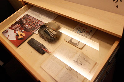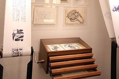 | 中 村 | そう、 引き出しを自分で開けて見てもらうんです。 最近のミュージアムは、 来館者用のパソコンを並べておいて 画面で検索してもらう方式が多いんですが、 ぼくは、ミュージアムに来てまで コンピューターの画面を見たり、 マウスを触ったりしたくないんです。 それより、本物をじかに見たい。 それも、見せられるんじゃなくて、 自分で能動的に見たい‥‥というわけで、 この記念館では、 愉しく見るための工夫がいろいろしてあります。 |