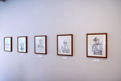 | 玉 置 | ここは「カフェ・タンポポ」っていう名前で。 『タンポポ』のポスターの原画を 展示しているんです。 伊丹さん、狸穴のマンションの2階で寝そべって これを描いていたんですけれど、 ちょうど渡辺謙さんを描いてる時に、 「二枚目は描きにくいなあ、難しいなあ」って。 個性的な顔はすごく描きやすいんですって。 |