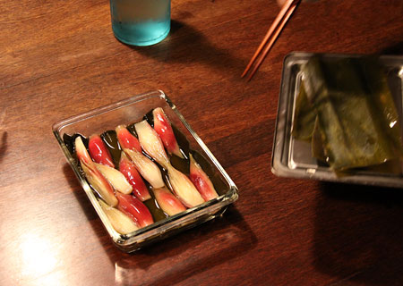 | 矢吹 | これはね、伊丹さんじゃないの。 どこかのお店で食べてね、 ちょっと普通の甘酢漬けとちがうから 訊いたら昆布で〆てあるんですよ、っていうの。 それ以上は教わっていないんだけれど、 甘酢に昆布の刻んだの入れても いいんだろうけどさ、 ぜいたくに挟んでみたんだ。 |