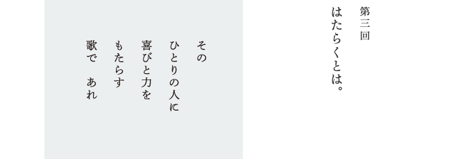 | ── | 「はたらく」とか「仕事」って、 なんなのかなあって、よく考えるんです。 |
