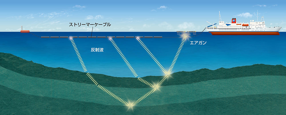 このデータを解析すると、地層の様子や断層の入り方などの海底下、