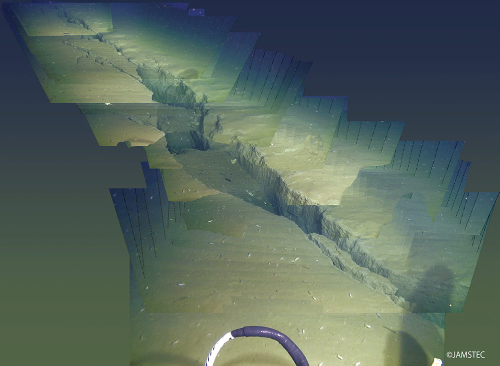 東北地方太平洋沖地震の発生後に「しんかい6500」で観察された海底の亀裂。©JAMSTEC