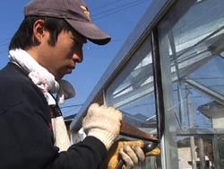 大きいビニルハウスの中に一輪車で持ってって入れる