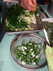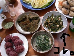 ネギをグルグルに巻いてしばって、胡麻和えにしたやつ。