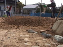 ゆかりさんは牡蠣殻の肥料を撒いてるとこ。