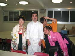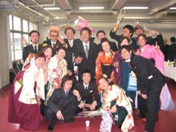 | <最後の卒業の巻> しちまったまったまったよ〜〜〜!!! ついに、わたくし、卒業してしまいました。 学生なのも、あと3日! 映画見にいかなきゃ!学生料金じゃなくなっちゃう! あ、でも、もう学生証ないからもうダメ? やばいやばい!! いや〜卒業式の日は、危ぶまれていたお天気も回復して よかったよー。 もし雨降ったら袴、キャンセルしようかと思ってたくらい 心配でさあ。 でもよかったー。 当日は寒い中、朝5時起きで、 7時から袴の着付けに行ってさ。 なんだか予約早すぎたみたいで、 式の時間まで渋谷のロイホに開店5分前に行って 開店と共にモーニングセットなんて頼んで 食べちゃってたよ。 袴が苦しくて、全部は食べられなかったけど、 ひとまず腹は満たされて、満足! やんややんやと終わっちゃったなぁあの1日。 式終わって、教室で学生証と交換で卒業証書をもらってさ。 学生証なくしちゃったうっかりおまめちゃんは 卒業証書もらえなかったんだけどね!ぷっぷっぷ。 いいじゃんねぇ、顔パスで。 しっかしみんなの学生証見たら、超若いの! 当たり前かもしんないけど、マジ4年って、 あっという間なんだけど、変わるよー。ほんと。 みんな学生証を顔の横にもってって、 記念撮影しちゃうくらい。レアだった! ビフォアーアフターっぷりがすごかったわ〜。 でも、おまめちゃんは、学生証持ってないから、 見比べらんないんだけどね!ぷっ。 んで、中庭でクラスの集合写真を撮って、 先生とか、用務員さんとか、マスター(学食のシェフ) と一緒に写真撮ったりしてさ。 ![]() ほら。白い服の方が、マスター。 お世話になりました! その後に、大きい教室で、学科関係なく 卒業生みんなで祝賀会。 お花をたくさんもらう。 あんなにお花もらったの、初めてだったよ。 うれしかったホント。ありがてぇありがてぇ。 そしてその祝賀会は立食で、 食べ物飲み物が机にいっぱいあったんだけど、 マジ振り袖が邪魔でさあ。 袖が気になっちゃって、手のばせなくて 残念ながら食べ物ほとんど食べれず・・・。 思わぬ盲点だったね。 手のばすと、たらーんて。 でも、祝杯はしっかり飲みましたよ。 野球の優勝祝賀会の時に、お酒の入った樽を割るじゃん。 鏡開きっていうんだっけ? あれの中に入ってるひのきのいい匂いのお酒飲んだり、 3年生からのお祝いのシャンパンみたいなのとか、 ビールとか。 バリでの日焼けと、お酒で、顔赤黒くなっちゃってんの! 俺ってば。 いやあでもゴキゲンでしたよ。 その後はゴキゲンなまま、急いであいにくの小降り雨の中 渋谷まで袴を脱ぎに行って、 ついでに、プリクラ撮っちゃったりして、 かなりレアな袴プリクラゲット!!!宝物だ! んでその後はもちろん朝までコース。 んで、謝恩会、二次会、三次会。 居酒屋は、スーツ姿のヤカラ若者が多くてさ。 他の大学の卒業式を迎えた人がいっぱいだったの。 「どこ大学ですかあ?」 なんてからんでくるから、 「どこ中?(どこの中学校)」 って聞き返してやりましたとも。 そしたら、 「どこ中といえば、色々いますけどー・・・」 って、真顔で答えてて、 ちょっぴりびっくりしちゃったけどね。 道で、おばさんが 「卒業式ですか?おめでとうございますぅ」 って声かけてきたり、 居酒屋の板さんが 「今日卒業式だったの?どこの学校?おめでとう」 って言ってきてくれたり、 なんか、それまでは自分の中で 卒業=『めでたいコト』感が薄かったんだけど、 実感しちゃったよ。 そっか、わたしはめでたいんだ。と。 自分の中では、『ちょっぴりさみしいお祭り』としか 認識してなかったみたい。 だから、 『ちょっぴりさみしいけど、とってもめでたいお祭り』 に、変えたの!! なんだか、せつないなあ。 ああ、せつねーーーーーーーーー! 卒業式といえば、涙。ですが、 案外、泣かなかったんだよね。 高校の卒業式は、歌たくさん歌ったりして、 もう、超剛球号泣豪速球だったけど、 大学の式は、全然そういう雰囲気じゃないし、 たんたんと、偉い人から祝われておしまい。みたいなさ。 まあ、つまんなくはなかったんだけどね。 念のため、バッグにはハンケチ入れといたけど、 そんな暇もなかった! でも実はあたし卒業式の約1週間前に泣いたんだったわ。 その日は4月から沖縄に行くことになった友達の 「いってらっしゃい会」でみんなで屋形船を貸しきった 宴を開いたのよ。 20人ちょいくらいいて、 みんなで雨の中船に揺られながら、 飲んで食べてわっはっは!でさ。 お台場を海の上から見たりして、 なかなかオツでいいもんだったよ。 その沖縄に行く子も、 「俺の夢ベスト30に入ってたからうれしい!」 って言ってたし、えがったえがった。 んで、その後、アウェーの新橋で居酒屋に入って、 みんなでじゃんじゃか飲んでて、 吐くまで飲もうと心に誓っていたのに、 違うものが出ちゃったんだよねー。 こうやって20人とか集まってみんなで飲むことは もうあんま出来ないんだろうなあ〜さみしいなあ〜。 なんて思っ