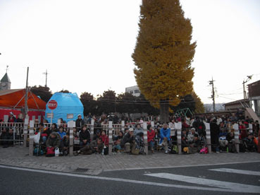 何かを待つ人々。お行儀よく場所取り。