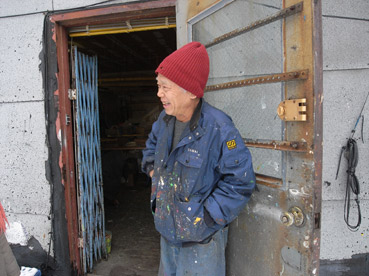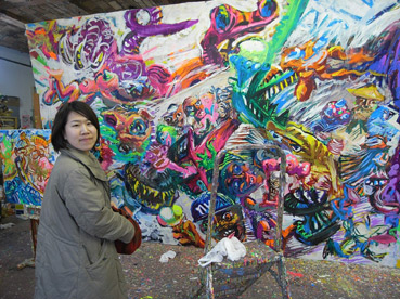 アトリエの、大きな作品の前にてザカちゃん。