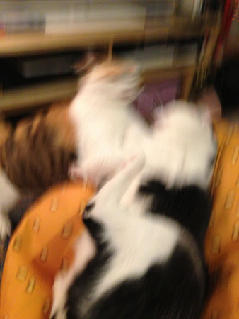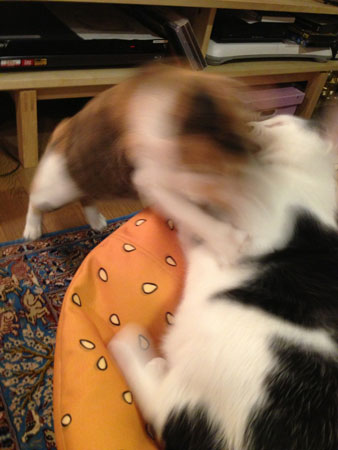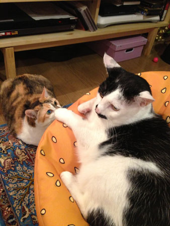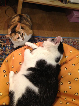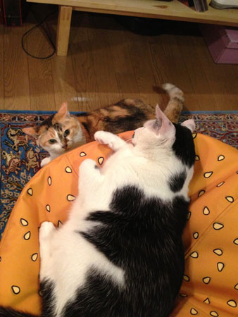 <眠いと、ビクン!と、トークショー。> ジュにちわーっす! いやいや、なんだか、もう6月も半分過ぎましたよ! ひゃー早〜〜っ。 突然ですが。 美容室のシャンプー台って、 どういうわけだか、眠くならない? あそこ、すごい眠くなるわー。 もうね、子どもの頃から。切られてるときも、寝ちゃうし。 いまでも、覚えているんだけど、 子どもの頃に行ってた美容院が、天窓のあるところでさ。 シャンプーのために、イスの上であおむけになると 天窓から差し込む太陽がまぶしくって、 あったかくって、ぽかぽかしながら、寝ていたよ。 雨の日だと、残念なの。 「あー、あのぽかぽか、今日はないんだなぁ」って。 かわいいねぇ。(自画自賛) こういう牛を見ていると、同じように、 ぽかぽか気持ちいいんだろうなぁと、 思うね。 「シャンプー台が眠い」という話から、 ズレてしまったけども。 戻しますとぉ〜〜。 この間も、 シャンプー台でトリートメントしているときに、 うかうかと眠っちゃって、 それはそれは気持ちよかった。 その気持ちよさは、長く続かないことは、知っている。 できればこのまま、何時間でも眠っていたいくらいだけど、 それは無理な話なので、 できるだけ堪能しようと、あえて目を閉じ続けて 眠るのです。 電車2駅でも、眠るときがあるからね。えっへん。 (嗚呼、この、睡眠に対しての欲深さ。 どうしたらいいんでしょうか。 社内では、眠り姫とか呼ばれてます・・・☆) ででで、トリートメントを流すために シャワーがシャーーーって出た途端に、 その音にびっくりして「ビックーン!」って 飛び上がっちゃったのよ! 猛烈に、恥ずかしかったのと同時に、 自分で、そのシーン、見たかったー! 転んだときとかも、自分が転んだことが 一番、おかしくって、ツボにはまるよね。 「あんな所でつまづいて、転んでやんの、あたし」 って、笑えるんだよなー。 できれば、そのシーンを見たいんだよね。 あとさ時々、作業中にどうしても眠くて 睡魔と格闘しているときに、 右手で握ったマウスを持つ手がピクンッ! てなっちゃって、 デスクにマウスを叩きつける! みたいになっちゃうときが、ある。 あれも、相当恥ずかしいね・・・。 「ね」って言われても、ねぇ。 ああ、恥ずかしい。 電車に乗ってて、うとうとして、ビクンッ!なっちゃうのは しょっちゅうあるけどねー。 とにかく、「ビクンッ!」は、総じて恥ずかしいし、 おかしいです。 そうそう、「犬と猫と人間と2」という映画は、 ほぼ日でも、1に続き、 少しお手伝いさせていただいたんだけど、 2の上映後のトークショーというものに、 妖怪・猫吸い(ボランティアの坂本さん)と 週末に出させていただきまして・・・。 わたくし、まったくしゃべり慣れてないし、 とてもまじめな内容の映画だから、むずかしかったけど、 少しでも想いが伝わるといいなぁ。 東京でもまだやってるし、 他のところでも、これから公開予定みたいなので、 行く前は「きっと、つらいんだろうなー」と 正直、気が重いけど、 肩を寄せ合い、だれかと一緒に観てください! ひとりだと、けっこうもんもんとしちゃう かもしれないんだけど、 だれかと行くと、解決はできなくても、 観たあとに、そのもんもんを共有できるから、 だいぶ楽なのですよ。 さささ、うちのお2匹ちゃんたちはと言うと、 なんか、軽いケンカを目撃してしまったので、 出しちゃいます。 お?なんだなんだ?? ▲ハンバーガーの下を通るミッツに、 牛が上から、ちょっかいを出したら、 ミッツが「なんやねん?」と、メンチきり! ▲お、お互い、見あって見あって。 ▲ このときのミッツは、 「な〜な〜」と牛の目を見て、何かを訴えかけている。 牛がよそ見をした瞬間・・・ はっけよ〜〜〜いのこったーーー! のこったのこったー! ▲あ、いっちゃった。 女心って、むずかしいっ。 さー今週も、気圧とか、風邪とか、色んなものに、 負けへんでーーーー!