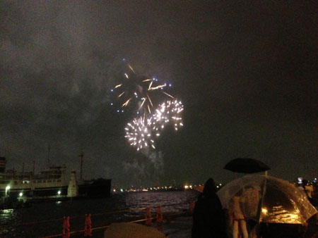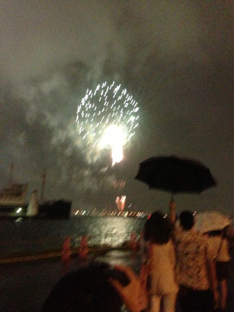 <夏の締めくくりの花火。> おじいちゃんおばあちゃん、 いつもありがとう敬老の日にちわ〜〜〜っす。 9月は2週連続で、3・REN・KYUがあるとですよー! いや〜さ、飛んだわ、飛んだ。 2週連続でお伝えしておりました、 鹿児島に観に行ったけど飛ばなかった、打ち上がらなかった 小型ロケット「イプシロン」飛んでいった〜! 無事成功してよかったね、おめでとう! わたしは生中継では、気を抜いていて うっかりと見そびれちゃって、 youtubeでちょっと遅れて見た口ですけど、 小型だからか、ずいぶんとふわっと、さっぱりと 上がるもんだね。 まだご覧になってない方は、コチラで見れますよ。 (おせっかいにも、打ち上がる1分ちょっと前から 再生されるようにしといたぜ!) やっぱりあのカウントダウンは、ドキドキするわあ。 しっかし、小さいなぁ。 H2Aロケットというスタンダードに比べて、 約半分の長さらしいからね。 25m弱だから、25mプールが立ってて、 それが空に打ち上がるみたいな感じだ。 やっぱりけっこう小さいよね。 東京タワーが333mで、スカイツリーが634mでしょー。 ゴジラ(初代)が50m、 ガンダムが18mで、エヴァンゲリオンとウルトラマンが 40mらしいから、ふむ、なるほど。 架空のものと比べても意味ないけどよ! まあ、気にしなさんな。 無事に打ち上がって何よりだよ。 そうそう、先週のことで恐縮ですが。 たまたま見つけたネットの記事に、 気になるものを見つけまして。 「横浜スパークリングトワイライト2013」という イベント。 打ち上げつながりというわけでもないんだけど。 土日に30分だけ打ち上がるって書いてあるから、 夏に花火大会を逃したメンバーで誘い合わせて 行ってきたのです。 しっっっっかしぃぃぃぃぃぃ! 当日は、大雨。 大雨というか、むしろARASHI。 その日は、美容院で髪を切ってから、 行こうと思ってたんだけど、 髪を切ってたら、もう、ものすごいのよ雨が。 バケツをひっくり返したような雨。 ずっとバケツをひっくり返され続けてるみたいな。 待ち合わせに行くにも、みんな家を出れない。 あまりにもすごいから、何度も電話で確認するんだけど 毎回 「予定通り、行われます」っていう録音が流れてくる。 うそぉぉぉ?ほんとかなぁ?? もう雨がつらすぎて、 いっそ「中止です!」と言ってほしい。 一緒に行くメンバーも、誰が「やめよう」と言い出すか、 探り合ってる。 「中止」という2文字を聞きたいがために、 何度も電話したんだけど、 やっぱりその2文字は聞けず・・・。 行きの電車のホームでも、かけてみたけど、 やっぱり聞けず。 こりゃあ、腹くくるしかないわ。ということで、 予定通り、行くことに。 ちょっとグズグズしてたから、駅に到着したのが 開始後5分くらい。 駅を出ると、おおおおおおおおおおお! ビルとホテルの間から、 ドーーーンという音といっしょに、 曇った空に、光がビャーーーーーーーー! ああああああああああああああああああ! ピーーーーン!テンション急上昇。 どうせ30分しかない、小規模な花火だしぃ。 横殴りの雨だしぃ。 とか思って、色々なめてたもんで、期待がゼロだったの。 ただ、みんなでびしゃびしゃになって 横浜まで行くのがイベントで、 それをノリで楽しもうとしてたもんだから、 想定外の美しさ、切なさに、 ものすごく感動してしまった・・・! はやる気持ちをおさえきれず、ついつい小走りで、 港に向かうぜ。 港に着くと、人がぜんぜん少ない! 何くらいと言えばいいかなぁ。 デパートの屋上のヒーローショーくらいな感じ? ・・・伝わる? 100人いないぐらい。80人くらいな感じ。 その少ない人々が、傘をさしながら、 港にたたずんで、花火を見ている。 ▲左下のほうに船、見える? 人が少ないから、とにかく静かで、 混んでなくて、プライベート感が強い。 「わたしのために、ありがとう」みたいな錯覚を 起こせるほど。 ああ、雨でよかった! いつの間にか、だいぶ小雨になってたから、 傘もささずに、立ちつくして、 全身でその光と、音を浴びちゃうよー。 夏のしめくくりに、夏にやり逃したことができた。 ものすごく、じ〜〜〜〜んとしちゃったよ。 嵐にベリー感謝。 完全に、「花火 対 俺」になれる花火なんて、 なかなかないでしょ〜。 昔、おばあちゃんと、おばあちゃんオススメの 小さい花火大会に行ったときのことを、 思い出したなぁ。湖でやるローカルなやつ。 あれは、また見たいな。 いやあ〜よかったよお。 こうなったら、来年も、雨降ってほしいくらい。 おかげさまで、 贅沢な夏の終わりの思い出になりましたとさ。 さ、今週のお2匹さん。 家でさんまを焼いていたら、 最近のお気に入りスポットである、 冷蔵庫の上で寝てたら臭ったらしく、 興奮して、ウニャウニャ言いながら さんま臭を堪能する、牛。 ▲興奮気味。 やっぱり魚には、そうとう敏感だね。 めったに焼かないからなあ。 すごい勢いでしっぽを盗んでったし! いつもはそんなことする子じゃないんですよ。 本