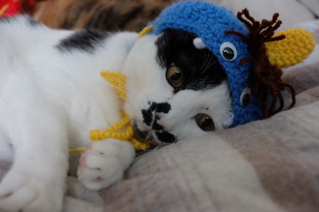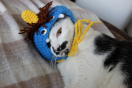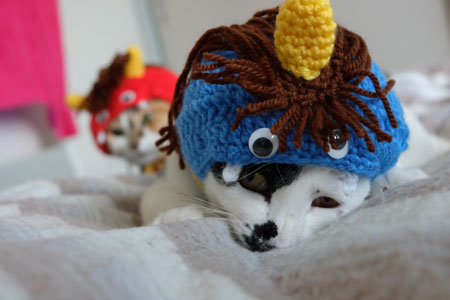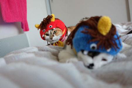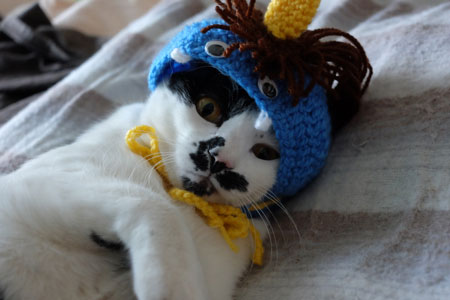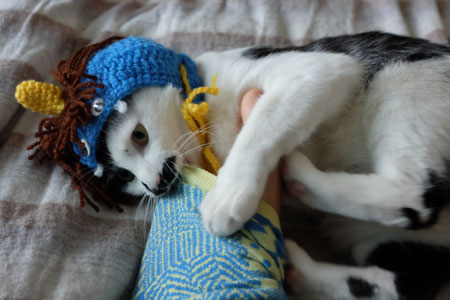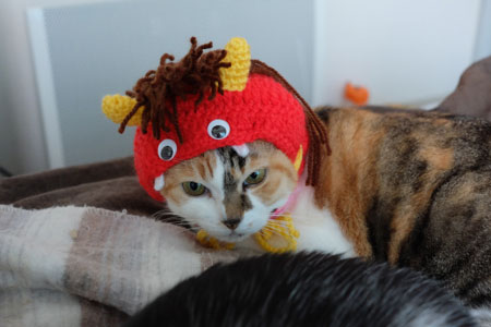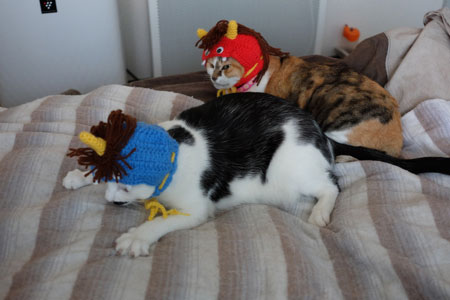 <節分にちなみまして。> せつぶぶぶぶぶぅうううううう〜んにちわーっす! 2月でございます。 ごきげんいかが?? 今年は今日のために、 少し前から用意していたものがあるよ。じゃじゃじゃん! おにはーそとぉーふくはーうちぃ〜。 ねこに慣れていないひとにとっては、 爪がびっくりしちゃうような、おねずさん。 ご安心なされ、これは、全然痛くないのじゃ。 なぜなら、爪がとがってないから。 のびたら、それはそれはするどい爪になるため、 その部分をカットしているので、 これは、刺さっているように見えるけれども、 全然だいじょうぶなやつなのじゃ。 てゆーか、節分関係ないし、 干支でもないし、ねこがねずみをかぶるって、 どういう気持ち?? かなり、浮かない表情に見えますなぁ。 ねこは、ねこをかぶることはあっても、 ねずみはかぶらないですものね。 ねこからしたら、いい迷惑ってものさ。 いまのは、前菜だとすると、 メインディッシュは、こちら! おにはーそとぉぉぉ〜〜〜ふくはーうちぃ〜〜〜! 青鬼です。 赤鬼です。 この鬼はなんとも言えない、 こわくない鬼だなー、おもしろいなーと 思っていたんだけど、この写真を見たチー坊が 「やっぱり、鬼ってこわいねー」と言っていたので、 もしかしたら、こわいのかもしれません。 角とか??牙とか?? 感じ方って、ひとそれぞれなのね。 ▲青さんが、くさくさしている・・・。 暴れだす青さんに、 静かにかたまる赤さん。 「鬼は外」ってなんだよー! 「鬼は外」ってなんだーーーーー! ちきしょーーーー! 「鬼は外」ってなんやねん。 寒いやないかい。 どないせーっちゅーねん。 超さみしいんですけどぉー。 「鬼は外」とか言われちゃってー。 まじでーなんでーー。 この間は、どこかの地方の節分祭りみたいなので、 鬼役をやっているおじいさんが さっきまでつけてた鬼のお面をはずして、 「やっぱりね、逃げ回るのが大変なんです」 と、インタビューに答えていましたけどね。 やっぱり鬼は鬼で、たいへんみたいです。ねこでも。 K粉だし、なんか霧っぽいここ東京ですが、 みなさん、今週もせっせと、まいりましょい。 福は内! 鬼は・・・おやすみなさいでいいかな。