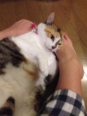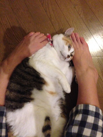 <ファミタク。> はいはいどうも〜〜。新婚ですにちわーっす! 先週はたくさんの方に おめでとうメールをいただきまして、 ありがとぅーーーです! お返事がまだできてないので、ごめんなさいね。 個人的なことなので、 書こうかどうしようかと思っていたのだけど、 赤裸々に書いてよかった〜。書いてこそ、俺! ブルーの話は、 「わかるわかる」 「そうだったけど、だいじょうぶですよ」 「教えてくれてありがとう!」 と、色々なご感想をいただきましたわん。 けっこうみんながブルーで安心した! ほんと、今までの友人たちからは、 そんな話、いっさい聞かなかったからなぁ〜。 さてさて、今週のネタを。 神保町に、へんなお店がある。 とオット(!)から聞いて、 近くに用があったから行ってみましたのよ。 その名も「ファミタク」。 「ファミ」の、ファミはファミコンと同じく、 ファミリー? 「タク」は・・・キムタク??まさか? 在宅テクとかの、タク?・・・それを言うなら、テク。 タクシー?オタク? なにかと思えば、「ファミマの卓球」だって! ファミマ自体が略してるから、 正しくは「ファミリーマートの卓球」か。 ちょっと前に 「今日さ、ファミマの奥に卓球あって、やってきた」 と聞いて、 「え?」 「あってさー。まじびびったわー。 ひさびさの卓球、超たのしいよ」 「え??」 ということで、行ってみたのよ。 ほんまや。あるわ。「ファミタク」。 軽くやって行こうと思ったんだけど、 中に入ってみると、おおおー!まさかの満卓! 残念ながらできなかったけど、混んでるものなのねー。 フラッと来てる感じのラフな人がほとんどの中、 めちゃ本気で、服も靴も完全に装着してる人が 1組いた! 会場内はクロックス的な簡易室内履きがあるっぽく、 全員それなのに、1組だけちゃんとした、 あの卓球部が履いてたマイシューズ! へぇ〜〜〜。 しかし、なんでファミマの奥に卓球作ったかね? しかも24時間営業で。 サイトを見てみると、 どうやら試合とかもやってるみたいだし、 教室まで開催している!けっこう本格的なんだ! たしかに、そもそも店員さんが24時間いるんだから、 24時間の何かをするには、いいよね。 でもまさか、教室までやっているとは・・・。 あ、これ、流行るんでないの? 色々と、できちゃうんじゃないの?? マンガ喫茶とかさ。マージャンは、長いか。 あとなんだろう。 あと、これって何かに似ている。 アメリカの町中じゃないところは、 ガソリンスタンドがだいたい、コンビニだったから、 それにも似てるけどー。 ああ、思い出したい!道の駅じゃなくてー。 「あ、あれもこの方式じゃんっ」って思いたい。 んだけど、ぜんぜん思いつかないっ!くやしー! 卓球かぁ、考えたねえ。 テニス、バスケットボールとか、バレーボールだと、 気軽じゃないし、面積必要だし、 フットサルなんてもってのほかだ。 卓球って、そう考えると気軽具合で使い勝手がいいんだね。 温泉にあるのも、そんな理由かしら。 あの卓さえあればいいんだもんね。 なんてったって「卓」の球だし、 英語で「table tennis」だから、 すでに名前がこの気軽さを表現していた! ビリヤードよりも、大衆的だし。 卓球、なんだかすっかり見なおしたぞ! また、リベンジに行ってみようと思うです。 さ、今週のお2匹さん。 ねこは、頭突きをする生き物。 ゴロゴロ言いながら、 顔が変わるほどゴンゴン、スリスリと、頭突きをする。 これは飼うまで知らなかったこと。 ものすごいよ、頭突き。 頭突かれると、もれなく、幸福感で満たされます。 そういえば先日、わたしのふとももの上に、 稲川淳二がいた。 稲川さん、もうすぐ、怪談の季節ですね。 牛のしっぽは、けっこう長い。 長いから、よくへんなところにある。 このあいだは、自分でにぎっていた。 これは稲川淳二さんではない。 かわいいかわいい牛さ。 ギュッとしてる右手が、なんとも言えぬ かわいさでしょ。ふふふ。 さ、今週も、よろしゅう〜〜〜〜!