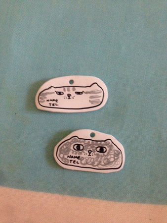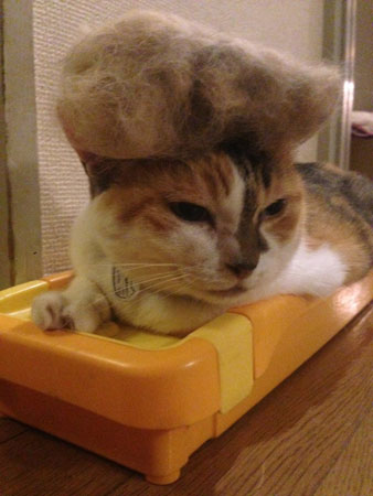 <ねこの抜け毛のリサイクルと、信玄餅プリン。> ニッポンーーーー! おーい、ニッポン! 次のコロンビア戦よろしくたのむぞー! せっかく期間限定で、 これをあわててしているのに、 ちょ、ちょっと、さみしいぞ! いや〜、ちょっとムッスだけど、 わりと梅雨梅雨していないじゃないの。 一瞬、「もう明けた?」って思っちゃうとき あったよね。 ま、そんなわけはないのだけど。 暑い季節になったので、 お2匹さんの毛を、づくろってあげています。 牛は、そうでもないのだけど、 ミッツの毛量が、ぱないのです。「ぱない」というのは 「はんぱない」という意味ね。 まじ、ぱないんす。 だって、15分くらいブラッシングしてたら、 これですよ。 さすがに、やせたもんね。 アフターブラッシングのミッツね。 で、その元ミッツの毛をなんかしたくて・・・ 乗せてみた。 なかなかじょうずにできない! どうして、自分の毛なのに、似合わないのだ! じゃあ、牛に。 いやだー、似合うじゃん! なんで〜?ああびっくりだね。 牛って、なんで鼻まわり汚れ隊なのに、色っぽいんだろう。 セルフイメージが、色っぽいのかなぁ・・・。 ま、でも、似合ってよかった、よ。 そして、お2匹には、最近、迷子札をつけたのさ。 迷子札つけたからって、迷子になるなよー! たぶん30年弱ぶりの、プラバン! トースターで焼くあれですよ。なつかしい〜。 すっごい小さくなるのねー。 実は、失敗してしまったことが・・・。 表面に電話番号を書いたんだけど、 それをやっちゃうと、写真を撮ったときに、 ふいに写っちゃって、色々公開しづらいということ! そこノーマークだった〜〜〜。 また作ろうっと。うふふ。ミニ工作たのしいよっ。 あのね、これはお伝えせねばと思っていることが ありますよ。 今までも、何度か信玄餅が好きということは ここで書いているんだけど、 また新しいやつ、やってくれちゃったんだよ、桔梗屋さん! それは、「信玄餅生プリン」。 ふつうの信玄餅よりも、少し大きめで、 白い、きなこ風味プリンに、黒蜜をかけるんだけど、 もうトロットロで、んんんんんんんんんっまいっ! やってくれちゃったよ〜。きなこ風味最高! これ、お土産で1個もらったものなんだけど、 もっと!もっと!おかわり!! こういう地方のものは、すぐに簡単に手に入らないのが、 いいのよねえ。 また、いつか食べるチャンスをうかがっておるよ。 は〜思い出しただけで、とろけるぜー。 ふつうの信玄餅は、最近すっかりと、 全部を風呂敷に出して、もんでなじませて食べる方式に なったよ。 この番外編ってやつね。 はじめはびっくりしたけど、慣れると、 これくらい馴染んだのが、いいのよねー。 必ず、指のどこかがベタベタしちゃうんだけどね。 それは、洗えばいいってことで。 さ、梅雨だのなんだの、乗り切っぺよ〜〜ん。 フレーフレーニッポン!