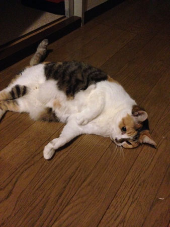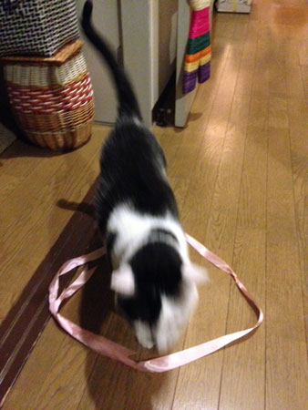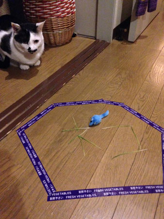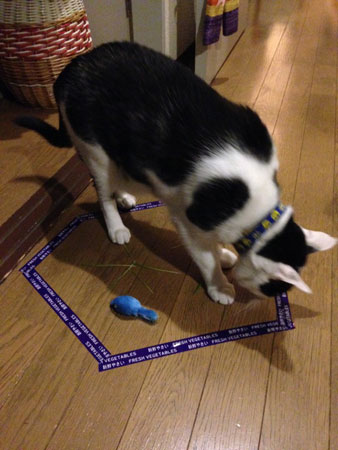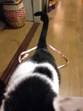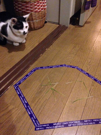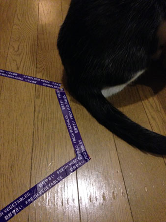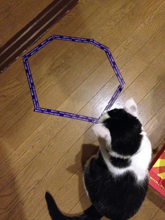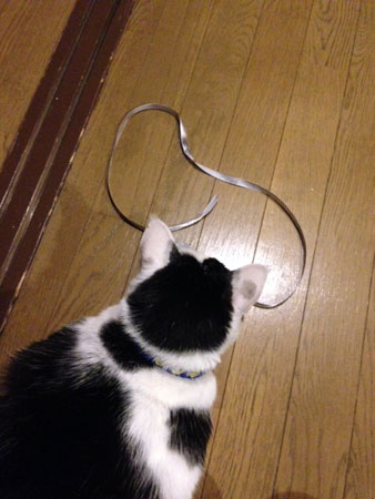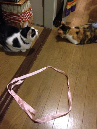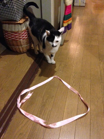 <流行りの「#猫転送装置」。> 11月ですよにちわ。文化の日にちわ〜〜〜〜。 秋ってあった?寒くね?もう、冬じゃね? なんて思っているのは、わたしだけではないず。 数年前に誕生日俺ゼント (俺が俺にあげるプレゼントのこと)で買った お気に入りトレンチコート。 半袖の。 半袖の・・・トレンチコートの出番は、なかった・・・。 悲しいです。 「これ、着る機会、ないなぁ〜」と毎年思いつつ、 できるだけ着ようとしてたけど、今年はゼロっす。 だって、寒いんだもん。半袖・・・。 ななな長袖のコートが欲しいとです。ゆーなです・・・。 最近ちょっと話題の、「猫転送装置」って知ってる? 猫界ではいま一番ホットな話題よ。 ねこの前に丸い輪っかを作ると、そこに入って、 まるで、ねこがテレポーテーションしてきたみたいに 見えるっていうやつ。 こちらの記事の方がおおもとの方らしいね。 これが、インターネットで世界中に広がり、 ツイッターとかで「#猫転送装置」とか 「#cat circle」とハッシュタグをつけて、 みんながやっている!ようだ! ちょうどうちにはねこがいるし、やってみない手はないよ。 ブームに乗るっきゃないじゃないか! というわけで、やってみたよ。 はじめは、リボンで丸を作ってみたところ・・・ お?なんだ? あれ? ・・・。 チーン。 別のリボンでも。 チーン。 色が、よくなかったかな。 うん、そうだな。あわくて、わかりづらかったね。 秋田の道の駅的なところで、思わず買ってしまった、 野菜を束ねるテープで、作ってみる。