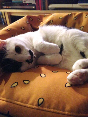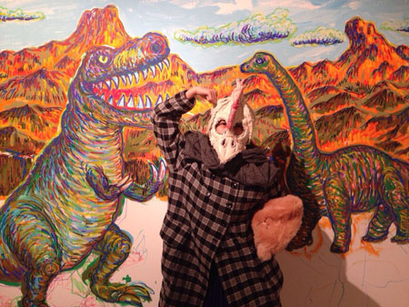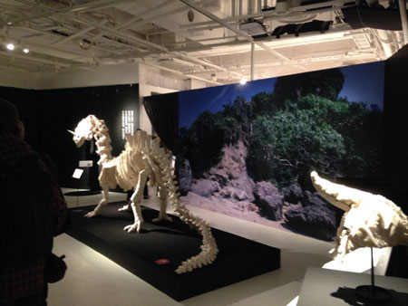 <大恐竜人間博。> にぎゃつぅ〜ふつぅ〜かぁ〜〜〜? にがつ、ふつか! にがつふつってか? 2月でございます。みなさん、ごきげんいかが? やっぱりそうだったか、と言いたい。 2月は、寒いわ。 毎年、2月が寒いと思って、心構えをして 過ごしているんだけど、 年によっては、「あれ?そうでもないか?」なんて 思えちゃう年もあるんだよね。陽も長くなってるし。 でも、その長くなった陽に、だまされて、 「あ、あったかそうだわ」 と思い込んで外に出かけると、寒いです、奥さん。 お気をつけあそばせ、奥さん。 春恒例の、アレも、来てるしね・・・奥さん・・・。 週末は、パルコで今日2日までやっている (しかも18時まで!) 「大恐竜人間博」という展覧会を観に。 どんな恐竜人間かというと、 画家の下田昌克さんが作っている 恐竜の骨の形の、ぬいぐるみ? というか、かぶりもの?というか、 布(絵を描くキャンバスらしい)で作った、骨。 それを、かぶったちいさい子どもたちの写真を、 写真家の藤代冥砂さんが撮り、 その写真に詩を、谷川俊太郎さんが書いてる。 という3人展。 おもしろかったーーー。 博物館の恐竜の骨とは、もちろんちがって、 目にも、手にもやわらかい骨。 しかも、かぶれちゃう骨。 「恐竜の骨をかぶる」っていうのは、 大きすぎて、まったく思いつかなかったなぁ〜。 でも、本当の大きさにしなくてもいいんだし、 布だから、重くないし、刺さったりしないし、とても安全! でも、ゴツゴツしてて、男らしくて、かっこよい! 実物じゃないにしても、大きくて、展示されてると 博物館感が出るね。ワクワクする。 博物館の骨は、何千万年前に、 同じ地球にこんな大きな生き物が生きていたのかー! という気持ちで見るけど、 これはもちろん、それは思わない。 そのかわり、あの何千万年前に生きていたものを、 ひとりの男性が 慣れないミシンで(慣れてるかもしれないけど)、 夢中で作った姿を思い浮かべたりしながら、 その先の恐竜に想いをはせたりして、 ちょっとふしぎな気分。 谷川さんの詩は、恐竜と、ぼく、の詩がいくつもあって、 それもよかった〜〜。 最後には、物販コーナーといっしょに、 かぶれるコーナーも! やったーーー。かぶってみたかったんだ〜。 物販コーナーにあった、『恐竜人間』という本を 一度手にしてから、一回戻して、かぶる! (本も、超かっこいい!) 自分、酉年なので、鳥っぽいのにしてみました。 会場で描かれた、下田さんの壁画の前にて。 今日の18時までだけど、おもしろいから、よろしければ! お2匹さんは、今日も、昨日と変わらず、 よく寝て、よく食べて、かわいいです。 ▲うらめしや? ▲うっとりや? ねこの耳を真ん中によせると・・・ ぶ、ぶさぎさん? 平和だね。 さ、今週も、エイエイオーやでやで〜!