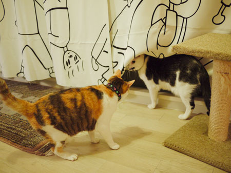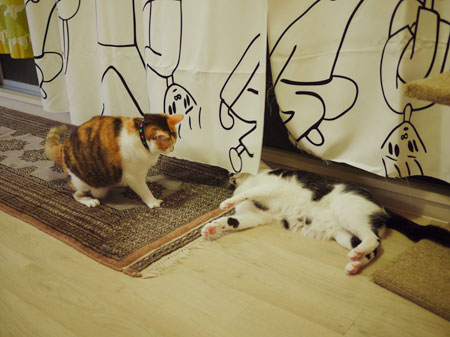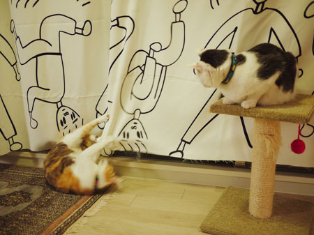 <図太くなる。> ゴールデンウィーク、目の前にちわーっす。 なんなら、もう、ゴールデンっちゃってる方も、 いるようですわよね、奥さん。 どないでっか? わたしは先々週も、先週も行こうとしたけど、 行けなかった映画に、ゴールデンウィークこそ、行く! そんな思い。 こどもの頃は、自分のルールや、家族のルール、 先生に教えられたルール、 色んなルールの中で生きている。 そのルールに苦しんだり、助けられたりしながら、 成長する。 んでもって、こどもの頃は、まっさらな人間だから、 自分でも色んなルールを作ってたっけなぁ。 たとえば・・・ お箸は右手。えんぴつも右手。あ、それはちがう。 走るときには、手をパーじゃなくて、チョキが一番速い。 とか、 寝るときは、上を向くとこわい夢を見るから、 右を下にする。とか、 コンタクトレンズは右からはめる。とかね。 あと、手を拭く時の、ペーパーはぜったいに2枚。 と決めて、中学生まで生きてきたわたし。 2枚で拭き終わるために、自分で言うのもなんだけど 上手に2枚を使って、計画的に拭く。 ある日、いつも通りに2枚で拭いていたところで、 某友人が、突然に「はい」っと、なぜか1枚渡してきた。 今までそんなことしたこともないのに! 「えええええええ!!!!!!!!」 いままで、十何歳まで、2枚でやってきてるのに、 3枚目を、何の悪気もなく、親切として、 いただいてしまった・・・。 わたしのルールが、目の前で音をたてて、 くずれていく瞬間・・・! こういう時は、どうすればいんだーーーーー! あれは、つらかった。 まあ、もちろん、いただきましたけどね。 「ガーーーン!わたし、いままで2枚って決めてたのに! だけど、ありがとう、いただいておく・・・」 みたいなことを、言ったと思う。 そんな繊細な、俺。 そこからは、ペーパーの枚数は、 もうどうでもよくなっちゃった。 そして現在。 30歳も越えて数年経ち、 自分がどんどん、図太くなっていくのを感じているのです。 ルールも、気にならなくなる。 こどもの頃からやってたやつで、 歯ブラシに、歯磨き粉をつけたら、 それを水で濡らさないと、いやだったんだけど、 それもいつの間にか、やらなくなってるし。 寝るときは、いつからか、上を向いて、 手を組んで寝てるのに、こわい夢は見ないし。 とかとか、色々と気にならなくなってるわ! この間、いちごを食べながら、色々おしゃべりしてて、 「いちごのツブツブ」の話になってさ。 知ってる? 一時、話題になってたから、ご存知かもしれないけど、 あの「いちごのツブツブ」が・・・ 実は、実なのよね。 じつはみ。 JITU WA MI。 みつあみ。じゃないよ。じつはみ。 いつも食べてるあの赤いやつは、茎だっていうじゃないの。 どういうこと!? ま、そっちはさておき、 あのツブツブひとつひとつが、発芽しちゃうの! あぁ、文字だけでぞっとする。 しかし、画像を見たら、もっとぞっとするぞー。 あたしあれ、すっごい苦手! もう、芽がひしめきあってるの! すっごい苦手なのに、みんなでいちごを食べながら、 その話をして、しかもその画像を検索して、 見て、「ギャー!」とか言って、ブルブル震えながら、 引き続き、食べ続けることができるわたしは、 だいぶ図太いのではないか? と、ふと思ったのですよ。 ま、他の人たちも、 「え〜〜これがね〜。きっついなぁ・・・」 とか言いながら、食べてましたけどね。 ま、類は友を呼ぶってことかしら。 きっとね、図太くなっていないと、社会とか、 家族(うちは、人とねこ)とかとで暮らす上で、 色々不都合があるからだね。 図太くなるというは、大人になるということ なのかもしれない。わたしにとっては。 ・・・とふと思ったのでした。 さ、お2匹ちゅわんのお時間です。 お2匹ちゅわんは、こんなんですわ。 うん、きみたちも、図太いね。 もしかしてだけどぉ〜 もしかしてだけどぉ〜 それってフチ子さんの後釜 ねらってんじゃないのぉ〜♪ (by図太っく) お2匹でじゃれ合う。 途中の、休憩中。 と思ったら突然に! ▲「あいつ、ひとりで何してんのかなー?」的な? ▲「こいつ、ひとりで何してんのかなー?」的な? おもしろい方々。 じゃ、今週も、いってみよー!やってみよー!