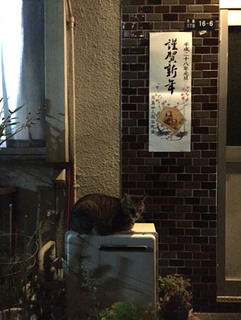 <月島でもんじゃ。> わしじゃ。 上から目線で、成人よ、おめでとう。 さすがに、 「成人式なんて、ついこの間だったのにぃ〜」 なんて図々しいことは、もう言うまい。 だいぶ前じゃ。 語尾を「じゃ」にすれば、これがいわゆる、仙人口調じゃ。 冬休み中には、お正月のお料理を食べ、 飽きてきたころにはカレーを作り、 〆には、もんじゃ。もんじゃじゃ。まだ仙人じゃ。 「正月にもんじゃ」っていうのは、 まったく定番じゃないけど、月島に行ったのニャ! (仙人はやめたのじゃ) 月島でもんじゃを食べるのは、だいぶひさしぶり。 高校生の頃は、なにかと 「打ち上げといえば、もんじゃ」が うちの学年だけかもしれないけど、流行っていたから、 わりとよく行っていたよ。 安くてワイワイ宴会っぽからかな。よく行ったなぁ。 待ち合わせに、ちょっと早めに着いたので、 ノスタルジックな気持ちを胸に持ちながら、 町を探索することに。 あぁ、昭和の風景や! ▲暗くて、雰囲気がまったく出てない写真じゃ。 町の一部に、こういう昭和の風景が残ってるところって、 都内でもよくあるけど、 月島は、丸々残っているね。 で、こういう場所には、ほら。 いるよねー。 ぜったいいると思ってたよ。 寒いから、風邪をひかぬようにな。 とにかくぜんぶの建物と建物が、すっごい密接。 長屋って言うのかしら? 何十軒も長屋?あれを長い一軒ととらえる? 表のメインストリートだけじゃなく、 裏の道にも、もんじゃ屋さんがいくつもあるし、 民家が多いけど、その中にも、もんじゃ屋とか、 バーとか、スナックがあったり、 建物をリノベーションした雑貨屋さんまである! なるほどーーー。 このリノベーション系は、今後も増えそうだね。 まあしかし、よくもまああそこまで、 もんじゃ屋さんが増えたこと! 「おとなりさんも、もんじゃ屋始めたらしいわよ。 うちも、始めましょうか」 ってなっていったのかなぁ。 いっしょに行った、約50歳のひとが、 「こどもの頃、 学校帰りに駄菓子屋でもんじゃを食べてたよ」 と言っていたんだけど、 まさに、それがもんじゃの起源じゃな! 当時は、子どもの食べ物だったんだってね。 なるほど。 あー、町並みがやっぱりすごいわぁ〜。 「どうやって駐車するのよ!」ってくらいの、 車の寸法ピッタリすぎる、ガレージのある建物とかさ。 機械式で、スライドして入れたとしか思えないのに、 そんなわけもなく、 そのガレージに軽トラが停まっている事実・・・。 アンビリバボー! 店先の、倒れたクッキーモンスターとか・・・。 やっぱりすごい町じゃ! そして、もんじゃのおいしさよ!安さよ! 安定の、見た目「なんじゃこりゃー!」感。 おそるべし、月島じゃ。 簡単に洗濯できる綿系の服で、また行くのじゃ! 冬は、洗いづらいセーターとかで行かないように、 お気をつけあそばせるのじゃ。 お休み中は、たくさん一緒に過ごせた、お2匹さん。 人が家にいるからと言って、 ずっと膝の上に乗って、ベッタリという場合もあるけど、 毎日、ずっと一緒にいるわけでもなく。 一日中、別の部屋で寝たりするのが、ねこ。 ▲干支やん。ひもがあれば、なんでも噛む。 ▲ひまだなぁ。 2016年もまだ11日目ですが、 今日時点の「2016年のビッグニュース」。 衝撃!牛が◯◯◯を・・・!? ねずみを。 ねずみのおもちゃを! か、かわいいやつでよかった・・・。 さ、今週もよろしく哀愁。バイバイ哀愁でーいっとぅ!