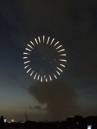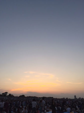 <夏らしく、花火大会。> 暑いでございます。2016サマーにちは〜〜〜。 オリンピックが開幕したにちはなんだけど、 毎度のことですがすっかり乗り遅れてて、 開会式のビデオ録画もできてなかったにちはだし、 競技もぜんぜん観れてないにちは。 いつも乗り遅れにちはで、「観たぞ」で なんとなく把握して、終盤ガッツリ観るパターン。 それがわたしの、乗り遅れつつ乗る、にわかなやり方。 なんてったって、いまになって ドラマ「ゆとりですが、なにか?」を観てますからね。 乗り遅れすぎですよ。我ながら。 しかもね、どんなときに観てるかっていうと、 洗濯物を畳みながら、観ている。 畳みながらしか、観ていない。 洗濯をしたはいいが、畳まずにどんどんたまって、 きれいなんだか、汚いんだか、他人にはわからないだろうが わたしからしたら、 ハッキリと「キレイ」と断言できるような衣類の山。 なぜハッキリ「キレイ」と言えるかというと、 洗剤のいいにおいだからさ。 ここ大事だしょ。 自分でもときどき、 「あっれ〜?これ、キレイ?だいじょうぶ? キレイじゃないんじゃないか?」 って思うときがある。 そういうときは、躊躇せず、そおっと匂いをかぐ。 これにつきる。ハッキリわかる。 一応、自分の名誉のためにもお伝えしておくと、 なんでもかんでもかぐわけじゃないよ。 だいじょうぶなはずなんだけど、ひょっとして? というとき、のみ。そおっと、ですからね。 あ、何の話だったかというと、 洗濯物を畳んでるときのみ、 「ゆとりですが、なにか?」を観ているという話ですよ。 少したまったときって、けっこうな量なわけですよ。 それを、ストレッチしながら、観ながら、畳む。 というのが、わたしの地味にたのしみな時間。 前は、海外ドラマにはまっていたときに、 お風呂の時間はもちろん、ありとあらゆる時間に 観ていたのだけど、 それは目も疲れるとか、そんな場合じゃないとか、 いろいろな理由により 「洗濯物を畳む時間」のみが残ったって感じダスよ。 あれ、畳むのイヤだな〜ってときには、すごくオススメ。 ま、そんなだから、ドラマもまー進まない。 でも、すごくおもしろいわよぉ〜。(いまさら) 週末、夏らしいこととして、江戸川の花火大会へ、 おさななじみメンバーみんなで行ってきまして。 その中に、ひとりのオットもいてね。 わたしたちのオットやパートナーたちって、 すごくわたしたちのことが好きなのよね〜。 なんかぁ〜、居心地いいみたいでぇ〜。 ま、ほんとに好きかはわかんないんだけど、 「女の中にいても、本人も周りも気にしない」タイプの 男性ばかりで。 それは彼らが変わっているのか、 わたしたちが「女」を感じさせないがゆえ、なのか、 はたまたわたしたちの ホスピタリティがすばらしいからなのか?(うぬぼれ) ま、そんなところはさておき、 江戸川花火に行ってきまして。 食べ物をいろいろそれぞれに持ち寄って、河川敷に行くも まあー人、人、人!ぱねぇ人の数! 1 ▲夕暮れと、すごい数の人。 あれは、東京ドーム何個分の人数だろうか。 去年は90万人という情報も見かけたけど、 それくらいいたのかもなぁ。とにかくものすごい数だった。 で、シート敷こうにも、敷けるスペースがない。 見当たらない。 しかし、ガンガン歩いて探していたら、 ちょうど、テントを片付けてる人がいて。 もしかしてーーー!と、 「あのぉ、このスペースって空きますか?」 と聞いたら、空きますと。ラッキー。 で、座って、暗くなる前にと、持ち寄った食べ物、飲み物、 いろいろモグモグしていたら、スタート。 たまたま打ち上げ場所がわりと近い、 すごくいい場所だったのだ。 なんてこったい。 ▲まだ少し明るい中の花火もキレイ。 たまや〜〜〜〜! かぎや〜〜〜〜〜〜〜〜! 近いし、体に振動が響いて、気持ちいいぞー! 花火って、「わ〜!」とかは言いつつ、 特におしゃべりもせずに、 静かに黙って、それぞれに何か思いながら、 考えながら花火と向き合う、あの時間がいいのよねぇ。 日本人っぽいのかねえ、あの黙って見るというのは。 いいもんだ。 最近は、神宮球場の花火を数発だけど、 しょっちゅう観れるから、花火自体をなめてたけど、 やっぱりものすごくいいものだ。 夏らしくて、うっとりできた。 お2匹さんは、花火の音を聞いたことが あるだろうか? え? ふわ〜お。 ぴぎっしゅ。 ↑ この顔がまるで人間みたいで、おもしろいわぁ。うちのこ。 むしろ、ヒゲが花火みたいだわよ。 ねえ、ミッツ? ▲バナナに夢中。 ま、そんなこんなですけども。 ▲仲良くないし、暑そうだし、意味不明。 さってと。今週も暑さに負けず。がんばりまひょー。 お体、ご自愛なすってなすって〜。