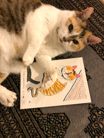 <チャレンジde後悔と、魚姫。> 三連休にちは〜っす。 あっついけれど、いかがお過ごし?? こうも暑いと、色んなことが起こりますわ。 誰のせいと言ったら、もうだいたい夏のせい。 いつもなら、強い信念を持って「ノー」と言えることも、 この暑さとか、疲れで、迷いが出てしまったり。 ついこの間、やっちまいました。 でも、ふと思ってね。 もしかして、「ノー」と言わない方がよいかもしれないぞ? 今まで「ノー」だったんだから、 一度は「イエス」と言ってみよう。 もともと、 そばは「せいろ」、ラーメンは「ラーメン」、 という超コンサバなわたしだったけど、 tooコンサバで、逃してる出会いがあるんじゃないか? とも思い始めて、その場で思い切った 「チャレンジザトリプル」。 アイスクリームをダブルで頼むと、 1こおまけについてくるというもの。 ダブルで、チョコミントと何かという、 いつものコースでいこうと思っていたのに、 「いま、チャレンジザトリプルですよ〜」 と言われ、一瞬考えて 「じゃあ、いきますっ」 と言ってしまった。 まず、はじめから決めていた 「チョコミント」をオーダー、 その次に、最近の気になったやつを2つ。 外だと溶けちゃいそうだから、 店内で食べ始めるも、一番食べたかったチョコミントを、 一番に言ってしまったがゆえに、 スプーンがなかなか届かない! でもまあ、なんとかなるだろう。と思いながら、 さじを進めてみるが、なかなかうまくいかない。 半分以上食べてから、歩き食べに切り替えると、 あれよあれよというまに溶けて、 一番食べたかったはずのチョコミントが 下のほうで、他の味と混ぜ混ぜになって、 チョコミントらしくなくなっている・・・。大後悔。 一番の本命なのに、やさしくしてあげられなくて、 ごめん、チョコミント・・・。 ぜったいにわたしの本命は、あなたよ・・・。 と思いながらも、 最後に少し残して「ごちそうさまでした」。 「たかがアイス」と思うでしょうが、 やっぱりやるべきじゃなかったと、 ものすごく後悔しております。 ちょうどヘトヘトに疲れていた後だったし、 わたしは、このチェレンジに負けてしまったのだよ。 くやしい。 食べれなかったことにというか、 食べれないのに、頼んでしまったことに・・・。 お調子者の自分を悔やんだね。 もうよっぽどじゃないかぎり、頼むのをやめよう。 わたしには無理なんだきっとね。しょんぼり。 なぜへとへとに疲れていたかというと、 土日に、ひびのこづえさんのTOBICHIイベントの ワークショップがあって、 それに張り切っていたからなの。 去年は、「かぼちゃ姫」だったんだけど、 今年は、「魚姫」ということで、 去年よりも、本格的?なコスチュームに 袖を通させていただいた! ひびのさんのコスチュームを着れるなんて〜〜〜。光栄! みんなでワークショップをしたあと、 この衣装に着替えて、 みなさんを事務所からTOBICHIまで誘導。 (その様子はこちらに載ってるので、よろしければ見てね) ▲前夜に試着して、仕事中の人へいたずらをする姫。 姫、薄い素材なんだけど、 けっこう暑くて、ひびのさんからいただいた 冷たいシートを体中に貼ったり、 アイスタオルみたいなものも首に巻いたりして、 がんばった〜。 姫、たのしい〜〜〜。 ▲帰ってきてからの撮影大会。 ロープ―(プロ)のオットに撮ってもらった。 大きな事故もなく、みんなで元気にたのしく お散歩できて大成功。 (終わってから ちょっとしたハプニングがあったけどね・・・) さ、今週のお2匹さんですが。 実は先日、ミッツがお誕生日というか、記念日でした〜〜。 絵は、やまねりょうこさんが描いてくれて。 うれしいわぁ。 ▲絵と同じ感じに! わーい。 記念日って、決めないと、 年々ぬるぬると歳をとっていって 「家に来て、◯年くらいだねえ」くらしかないんだけど、 まちがっているかもしれないけど、決めちゃうと、 忘れなければ、それは立派なお誕生日になって 「7月13日で、12歳」のコになったのです。 ドコノコで色んなコを見ていると、 年齢はもうちょっといってるような気がするけど・・・。 ま、健康で、日々かわいくゴキゲンなので、 よしとしよう。 牛は、さすがの牛なのに、 ちょっと夏バテ中かな?食欲が少し落ちている。 蓄えがあるから、まいっか。 ▲ちなみに牛の誕生日は12月ってことにしている。 ▲暑いのに、ちょっとくっつくお2匹。 さ、今週もがんばっぞーーー! 夏バテ注意!塩分、水分!