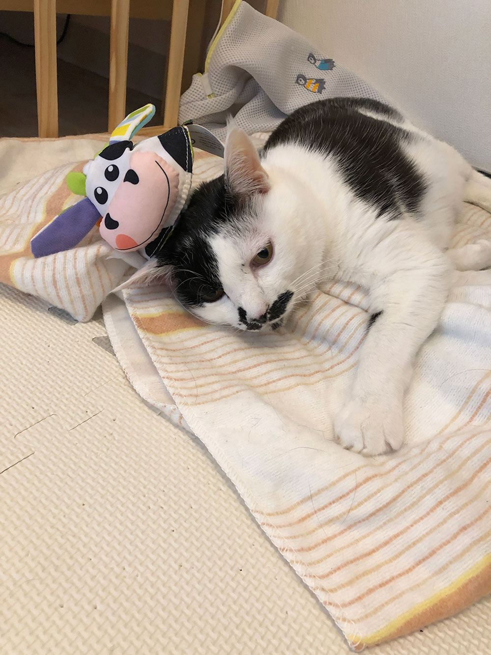 かと思ったら、急に床に寝転んで「死んだふり」をする。