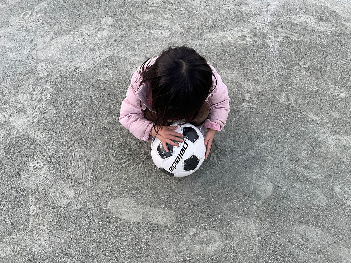 サッカーボールに、砂を乗せて「おけしょう」・・・。