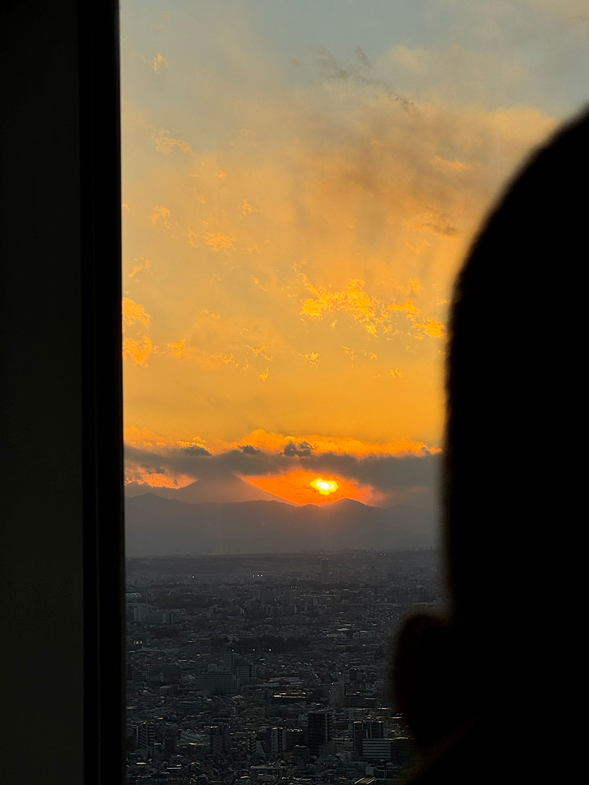 ▲おじさんの耳と柱の間から、富士山&夕陽をなんとか拝む。
