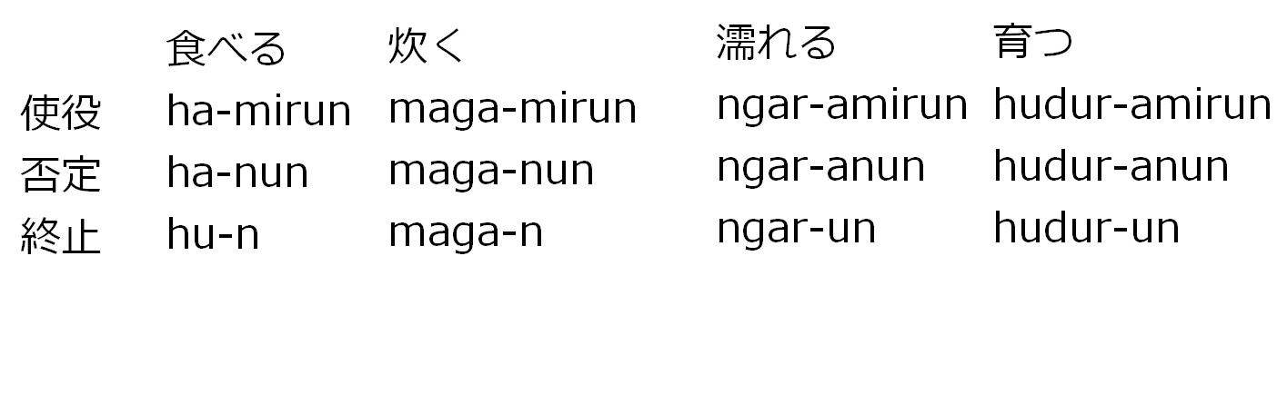 これで、与那国語の動詞活用が「どうなっているか」は、