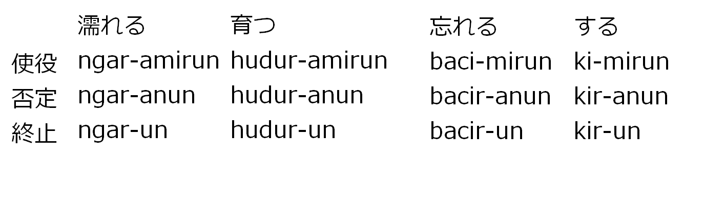 ngarun(濡れる)とhudurun(育つ)は、語根末が子音です。
