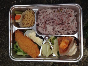 昼:町の食堂のお弁当(五穀米、秋鮭のフライ、
