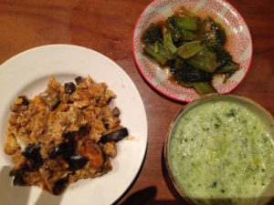 夜:残り物卵とじ、青梗菜のポタージュ、かつお菜