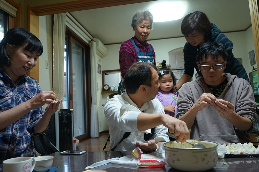 餃子を苦悶の表情で包むフクダさん。