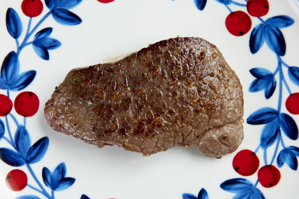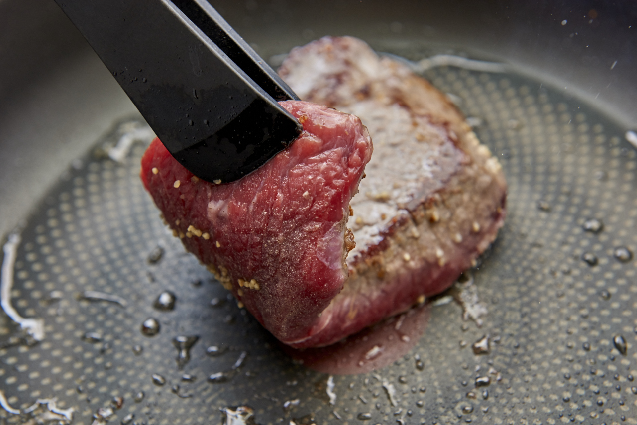 強火で熱したフライパンに牛脂をしいたら、焼き開始。