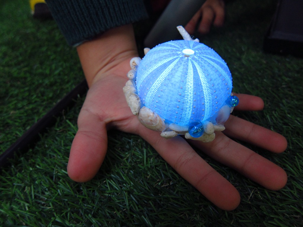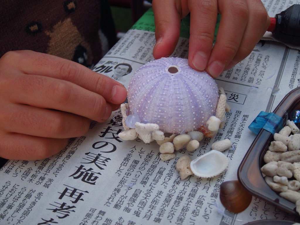 周りをサンゴや貝殻、ビーズで彩っていきます。