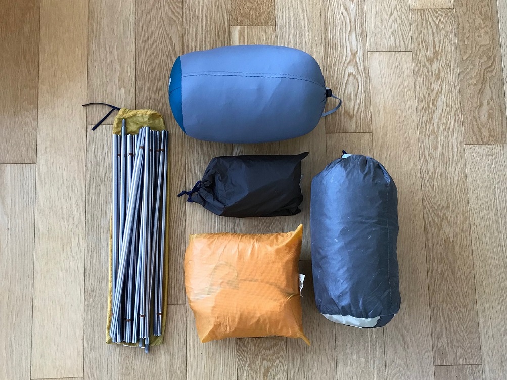 一番上にあるのは寝袋で、それ以外がテント一式。