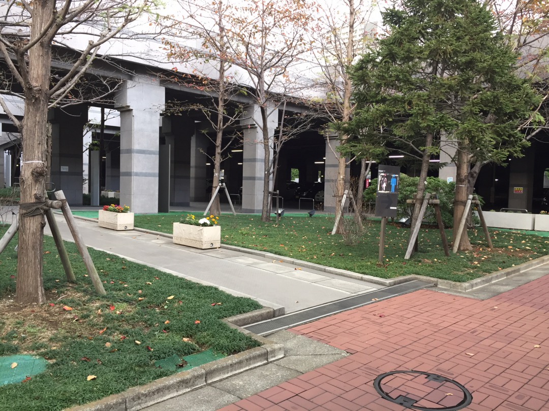 白いプランターと、地面に敷き詰められた赤いレンガは