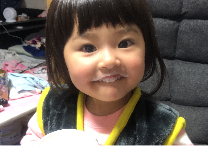 くちについた、牛乳ヒゲがそのままだ。