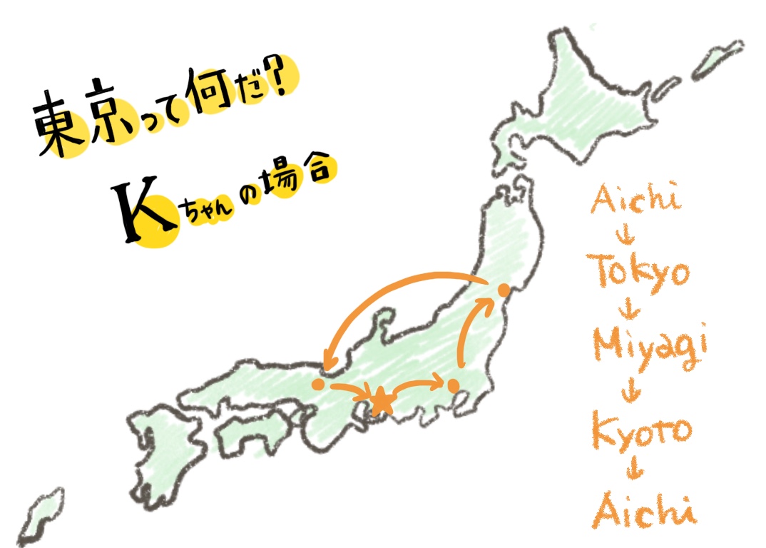 そっか。Kは名古屋出身で、東京、仙台、京都…って