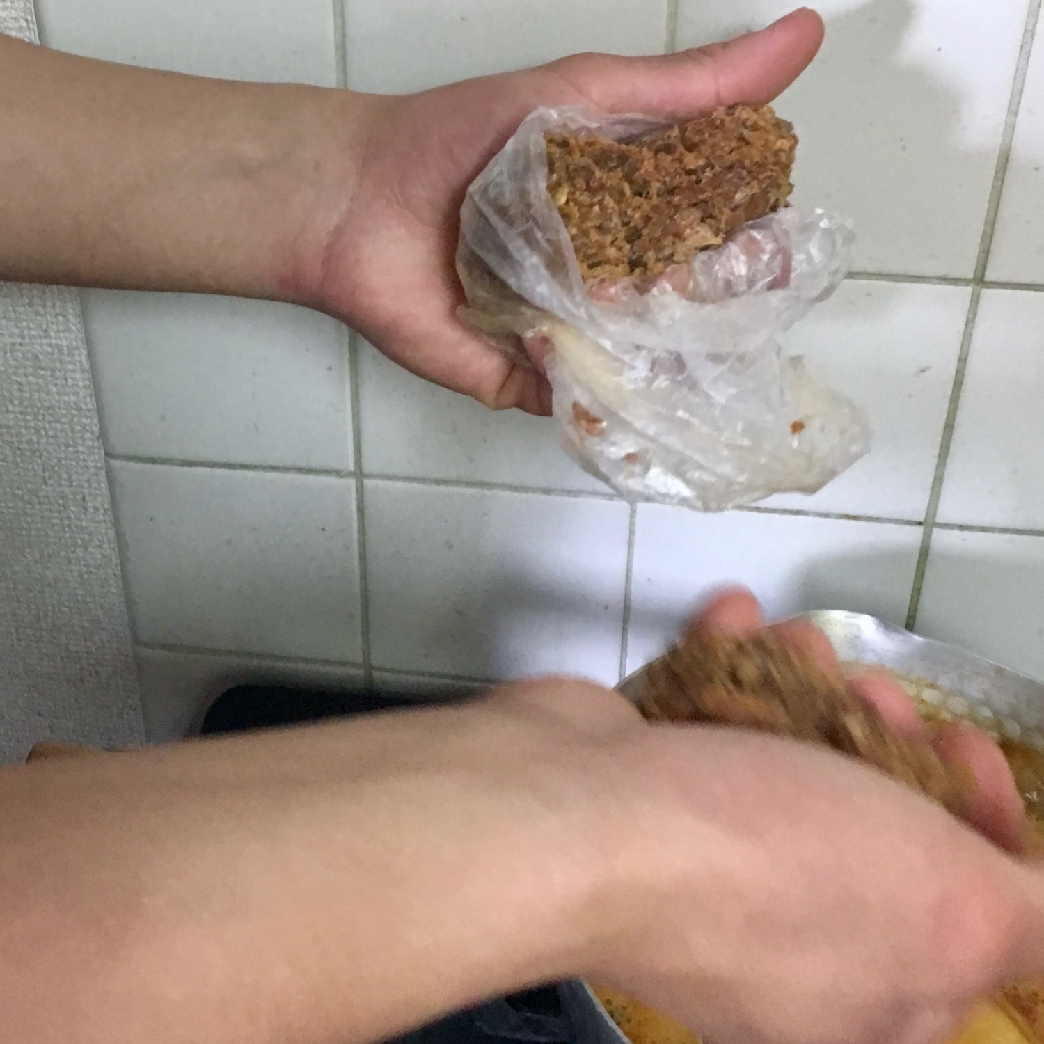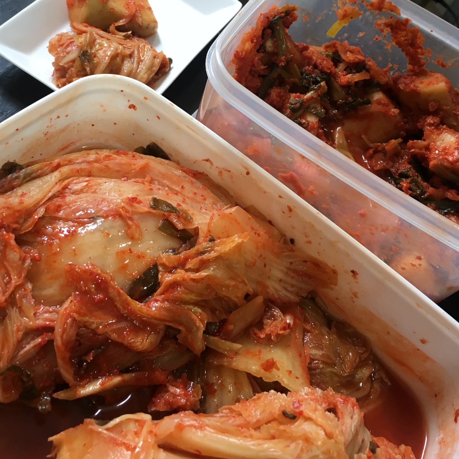 パクさん、慣れた手つきで、ハサミで白菜のキムチを切ります。