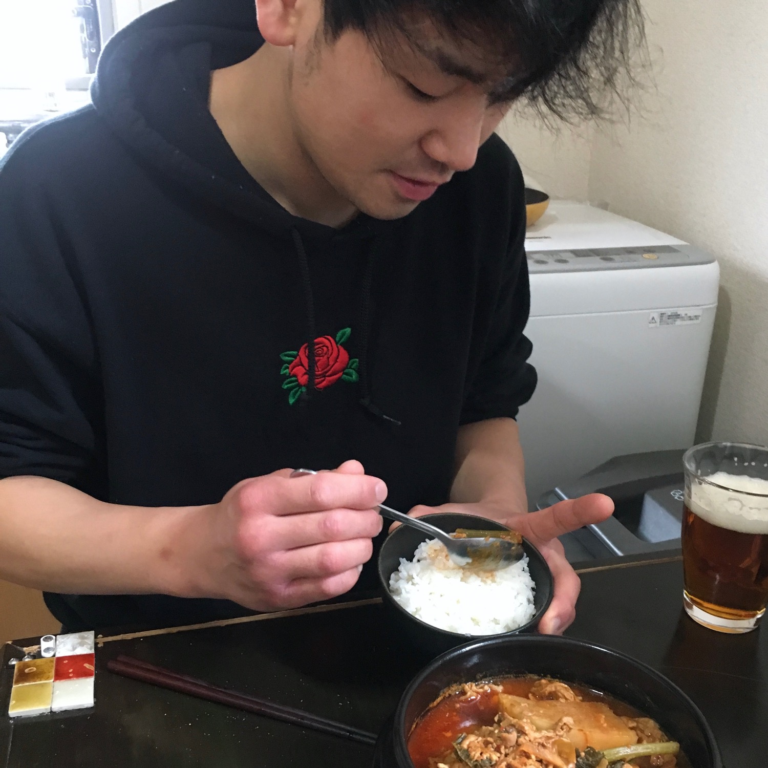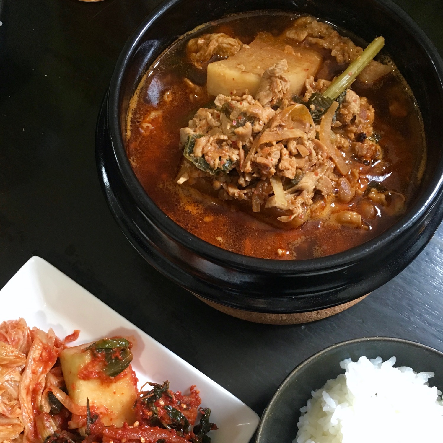 こうやってチゲをご飯にのせて、スープも一緒に。