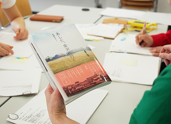 | スガノ | (『あした、金沢へ行く』を覗きこむ) ん‥‥? この写真、牡蠣ですか? 伊藤さん、牡蠣食べてます。 市場で食べれるんですか? |