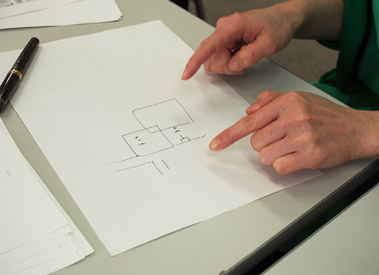 | 伊藤 | そして、最初に言った、名前のわからない どんぶりごはんの定食屋さんの地図を 描いてあげます。そのあいだに‥‥。 |