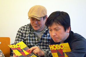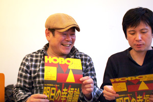 「ほぼ日」にお越しいただいた 『劇団HOBO』の3名様は、 おかやまはじめさんと古川悦史さん、 そして省吾さんでした。 |