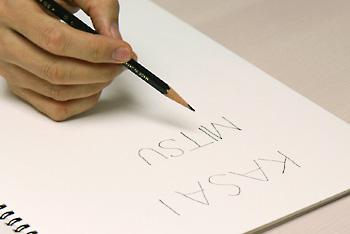 | 葛西 | いいですね。 文字ってまわりのスペースで変わりますよね。 例えば「か」っていう字があったとしても これがこの名刺大のスペースにある場合と 大きなスケッチブックに収まってる場合と 全然違いますよね。 あと真ん中じゃなくてちょっと左下にあるとか そういうことがものすごく大事で、 そこに無頓着になってると 字が汚かったりというのがあると思いますね。 |