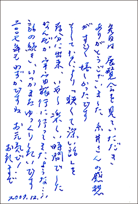 | 糸井 | 文字で言うと、 井上有一さんという人と、ぼくは会ってて 井上さんが例に出すのは 「野口シカの手紙」なんです。 葛西さん知らないですか。