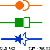 抗原抗体反応とは、生体が自分の身体を守るために 「異物を排除する」システムです。 体内にヨソ物(これを「抗原」といいます)が入ると 身体が「敵だ敵だ」と判断します。 敵を察知した体内は 抗原を攻撃する防衛軍「抗体」を作り出すのです。 そして、この防衛軍である抗体が 敵である抗原と反応して(抗原抗体反応) 異物を排除します。 そして、再び「同じ敵」が進入したら 体内は速やかに準備された抗体防衛軍によって 対処できるというわけです。 (免疫ができた、という状態) このとき、すごいのは敵ごとにあった形の 抗体を作るということ。 オーダーメイド防衛軍、なんですね〜。 ![]() これらの抗原や抗体はもちろん、イメージですが、 こんな感じに「カギ」と「カギ穴」のような関係のものを 作ってしまうのです。 ちなみに、予防接種もこのシステムを使っています。 弱くした「毒」をあらかじめ体内に入れて 抗体を作っておくことで 本格的な「毒」に備えるというもの。 また、本来「異物から身を守る」 ためのシステムである抗原抗体反応が 過剰に反応してしまった例が 「アレルギー症状」になるのです。 一見「血液型」の話から 逸れてしまったようですが 実はこの「A」「B」などの 血液型を作る血液型物質は まさに「抗原」なのです! そして、この血液型物質は 血液の赤血球上だけにあるのではありません。 だ液・胃液などあらゆる体液の中にも存在します。 犯罪捜査でもだ液から血液型わかっちゃいますものね。 最初に発見されたのが血液中だったので 「血液型」と呼んでいるのです。 うーん、確かにだ液型・胃液型って名前だったら ここまで流行らなかったかも。 体液だけじゃなく、血液型物質は 臓器や組織の表面にびっしりと生えています。 だから、このような「血液型物質」は 「自己と他者を区別する」抗原の旗印! といえるわけです。
