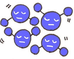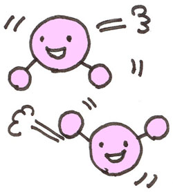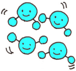 まず、普段特に気にかけてもいない 「水を火にかけるとお湯になって沸騰する」 という現象に注目してみましょう。 私たちが小人のような目を持って 水の分子の「つぶつぶ」を意識してみるのです。 水は沸騰すると、水蒸気というものになります。 液体だったものが気体に変化するのですね。 「小人の目」で見てみると ひとつひとつの水の分子が ぶんぶんと運動をしていることがわかります。 でも、液体の状態では、勝手気ままに 動き回っているわけではありません。 それは、ひとつひとつの分子の間に 「引力」がはたらいて、「ある程度」繋がっているから。 だから、コップに入った状態では形を保っていられるけど 机の上にざっとこぼすと流れてしまう「液体」になります。