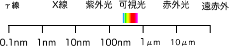 身の回りにある「温まる現象」を見つけたら 「これは放射、それとも対流?」などと考えてみるのも 面白い‥‥かもしれません。 例えば、太陽の熱が私たちの身体まで届いているのは 「放射」によるもの、なんて具合に。 さてさて、今回のお題である赤外線は どんな電磁波かといいますと‥‥ 私たちの目に見える「光」、つまり可視光ですが そのお隣にある電磁波になります。 ![]() 可視光は波長の短い方(上の図では左)から順に 赤・橙・黄・緑・青・藍・紫 ‥‥というように並んでいますね。 赤の波長が一番長いのですが それよりも波長が長くなると 私たちの目には見えなくなります。 これが、赤外線です! 100μm(ミクロン)くらいまでの波長の電磁波を 赤外線といいますが そのうち、2.5μm以下を近赤外線、 25μm以上を遠赤外線と呼ぶことがあります。 この赤外線、エネルギーは小さいのですが ちょうど物体の熱運動を起こすことができる 波長の電磁波です。 だから赤外線にあたるとモノが温かくなるので 赤外線は「熱線」なんて別名があります。